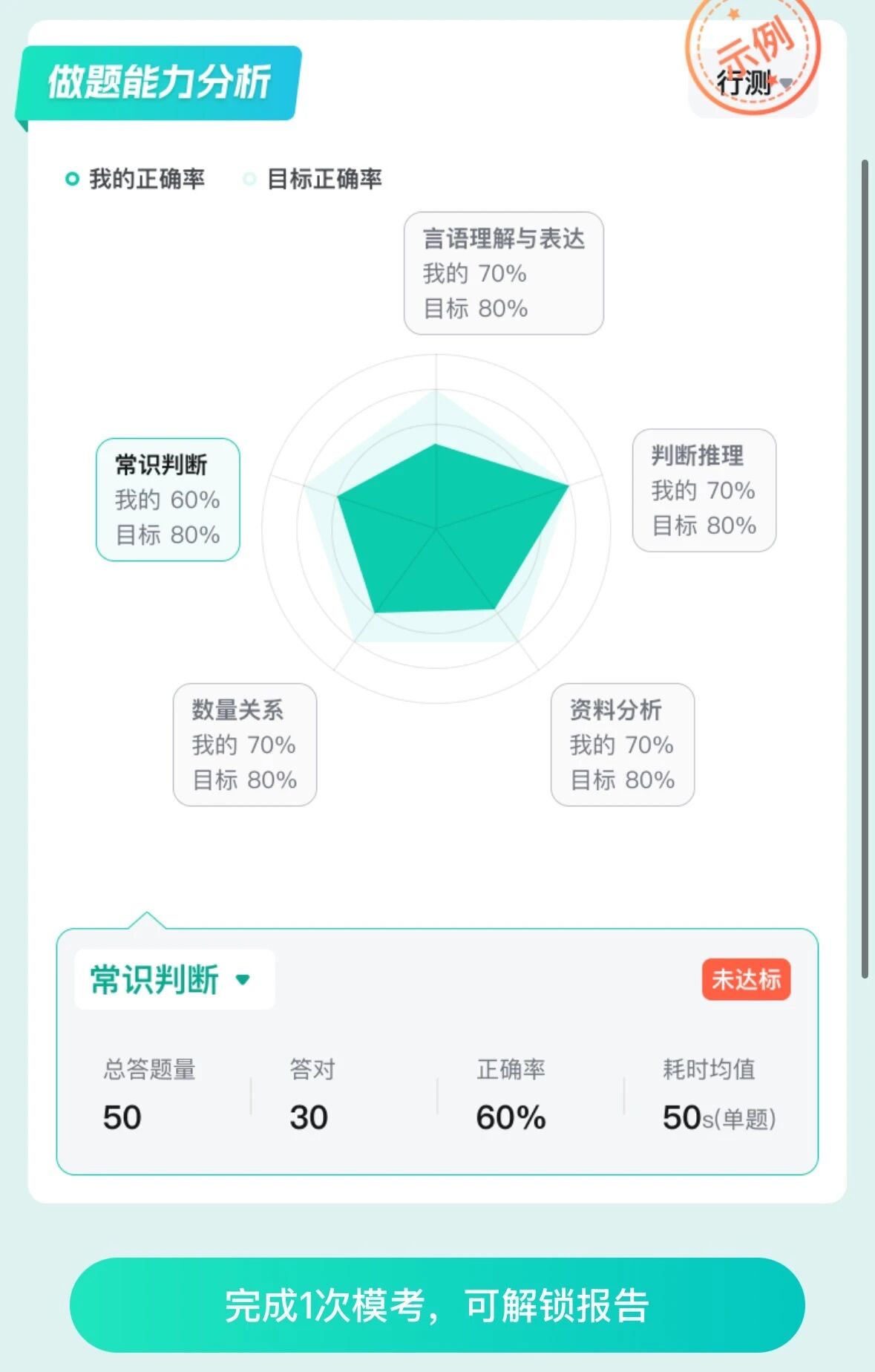 3??生成個(gè)人??紙?bào)告:考完就能查看??汲煽儭⑴琶敖馕?,生成的個(gè)人模考報(bào)告包含各模塊正確率分布、做題能力分析、筆試分?jǐn)?shù)yu測(cè)等內(nèi)容。