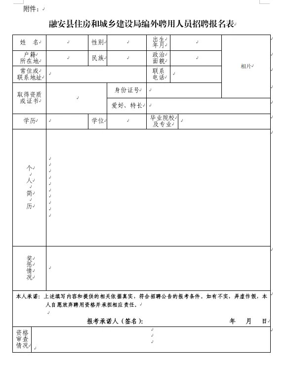 (1)報(bào)名方式:應(yīng)聘者將報(bào)名表等相關(guān)材料發(fā)送至融安縣住建局郵箱:raxjsj@163.com,報(bào)名材料主要包括:報(bào)名表(請(qǐng)自行下載填寫,并手寫簽名)、身份證、學(xué)歷學(xué)位證書(shū)、資格證書(shū)、獲獎(jiǎng)證書(shū)等。以上材料均需掃描成PDF版本。