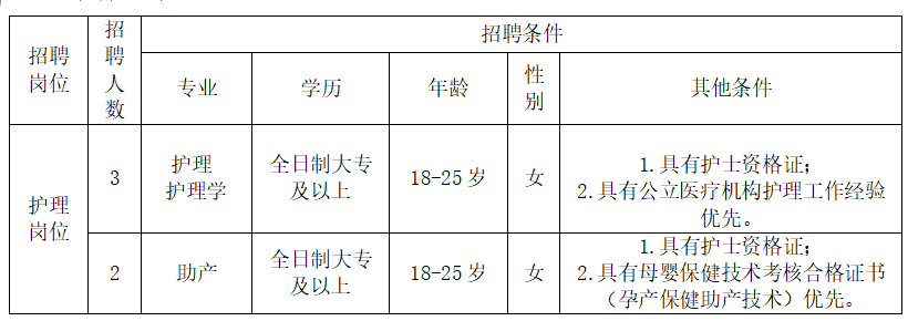 本次公開招聘護理崗位工作人員5名,具體招聘崗位、人數(shù)、資格條件如下: