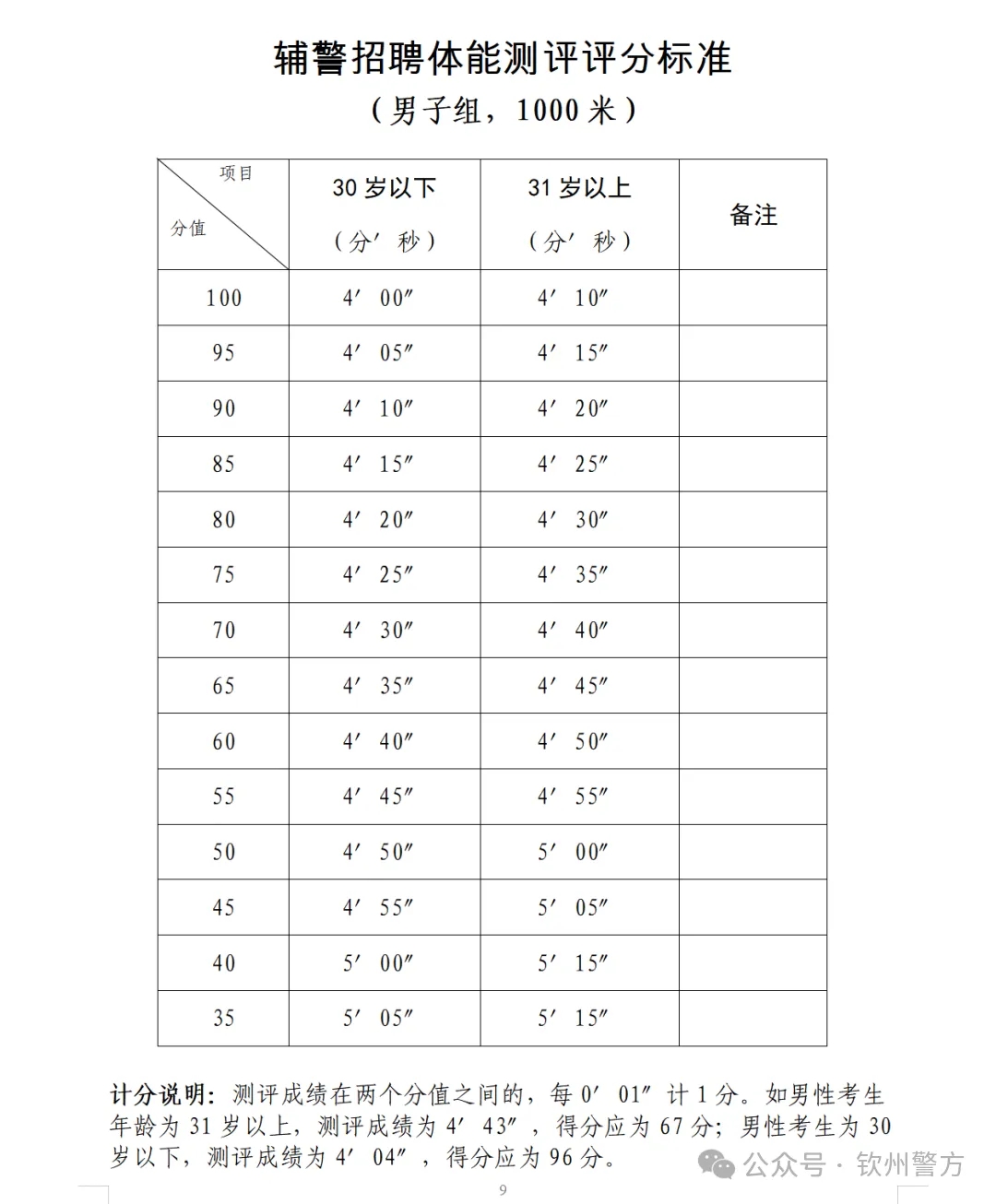 1.體能測試。資格審查合格的考生參加體能測試。體能測試項(xiàng)目為長跑,即男子1000米,體能測試計(jì)算成績,評(píng)分標(biāo)準(zhǔn)附后。