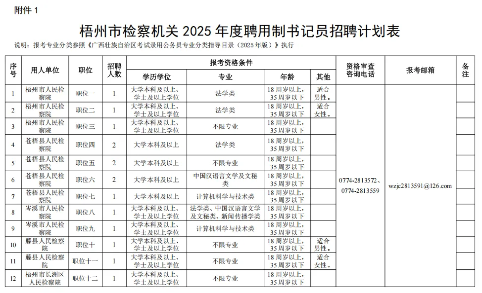 各職位具體報(bào)考條件詳見(jiàn)《梧州市檢察機(jī)關(guān)2025年度聘用制書(shū)記員招聘計(jì)劃表》。