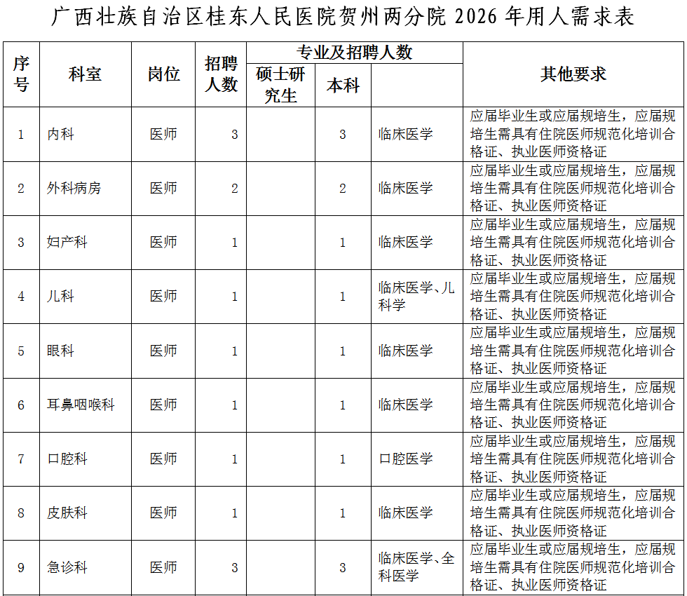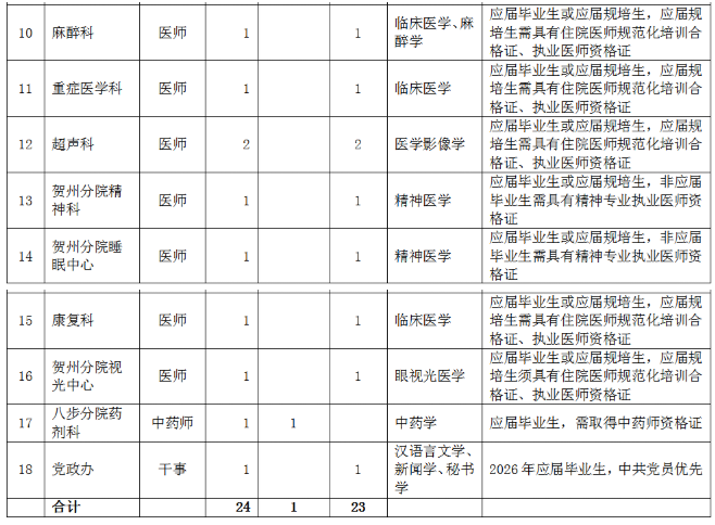(應聘報名二維碼)同時,按以下要求提供個人應聘材料(電子版)發(fā)電子郵箱:gdyy2817726@163.com(郵件主題請標明:“姓名+賀州兩分院”字樣)。應屆畢業(yè)生:個人簡歷、身份證、就業(yè)推薦表、成績單、各種獎項獎勵證書、外語等級證書等。非應屆畢業(yè)生:個人簡歷、身份證、畢業(yè)證、畢業(yè)證備案登記表、學位證、學位證備案登記表、職稱證、執(zhí)業(yè)證、住院醫(yī)師規(guī)范化培訓合格證、工作證明等。報名時所提交的申請材料必須真實、準確,因報名時提交的申請材料不真實、不完整或錯誤填寫報名信息,造成資格審查、面試資格審查不通過的,后果由報名人員自行承擔。(2)資格審核。人事科依據(jù)招聘公告和用人需求規(guī)定的資格條件對應聘人員簡歷進行收集和資格初步審查,經(jīng)招聘工作領(lǐng)導小組審核后,確定符合崗位條件報名人員名單,由醫(yī)院人事科電話或短信通知符合條件人員。(3)考核??己斯P試和面試由人事科負責組織實施,協(xié)助部門為醫(yī)務部、護理部、科教科以及用人科室,紀律監(jiān)督部門為監(jiān)察室。逾期未參加則視為自愿放棄。(4)試工。通過考核的非應屆畢業(yè)應聘人員,須到醫(yī)院試工5天。試工不通過,不予聘用。(5)體檢。體檢工作由廣西壯族自治區(qū)桂東人民醫(yī)院按照有關(guān)規(guī)定統(tǒng)一組織。體檢標準參照《廣西壯族自治區(qū)事業(yè)單位公開招聘人員體檢通用標準(試行)》《廣西壯族自治區(qū)事業(yè)單位公開招聘人員體檢操作手冊(試行)》執(zhí)行。體檢不合格或隱瞞真實情況致使體檢結(jié)果失真的,不予聘用。因體檢不合格空缺崗位的,將按考核的綜合成績,從高到低,順位補充體檢人員。(6)公示和聘用。對擬聘非應屆畢業(yè)應聘者在全院范圍內(nèi)進行公示,公示期為5個工作日,公示期滿無異議按程序辦理聘用手續(xù)。對公示有異議,經(jīng)核實影響聘用的,取消其聘用資格;對反映問題難以核實的暫緩聘用,待核實清楚后按有關(guān)規(guī)定辦理。